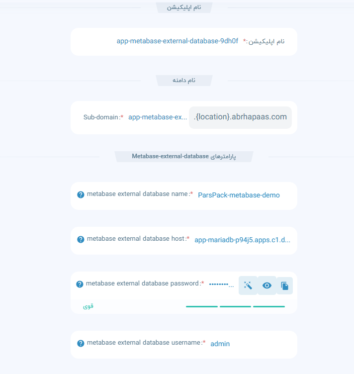 metabase external database name | نام دیتابیسی که میخواهید metadata مانند اطلاعات داشبورد و غیره روی آن ذخیره شود | parspack-metabase-demo |