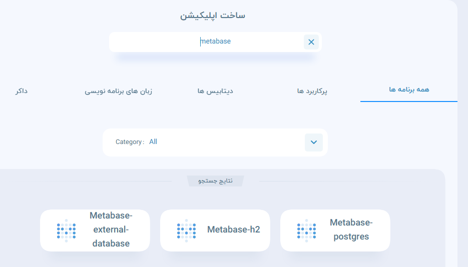در زمان ساخت سرویس متابیس در PaaS پارسپک، شما میتوانید با سرچ کلمه «Metabase» در نوار جستجو، نوع پایگاهدادهای که برای ذخیرهی دادههای داخلی متابیس (مانند اطلاعات کاربران، تنظیمات داشبوردها، کوئریها و غیره) استفاده میشود را انتخاب کنید: