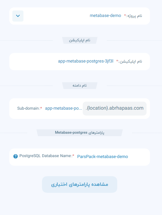 - در بخش «پارامترهای اختیاری»، مشخص کردن اطلاعات اتصال به دیتابیس PostgreSQL (نام دیتابیس، کاربر، رمز عبور و...)