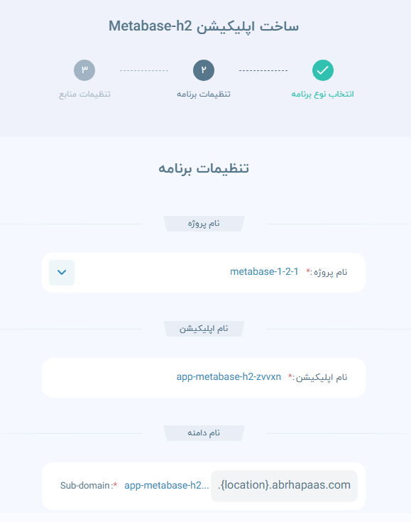 - وارد کردن نام اپلیکیشن، دامنه (Domain) و پروژه