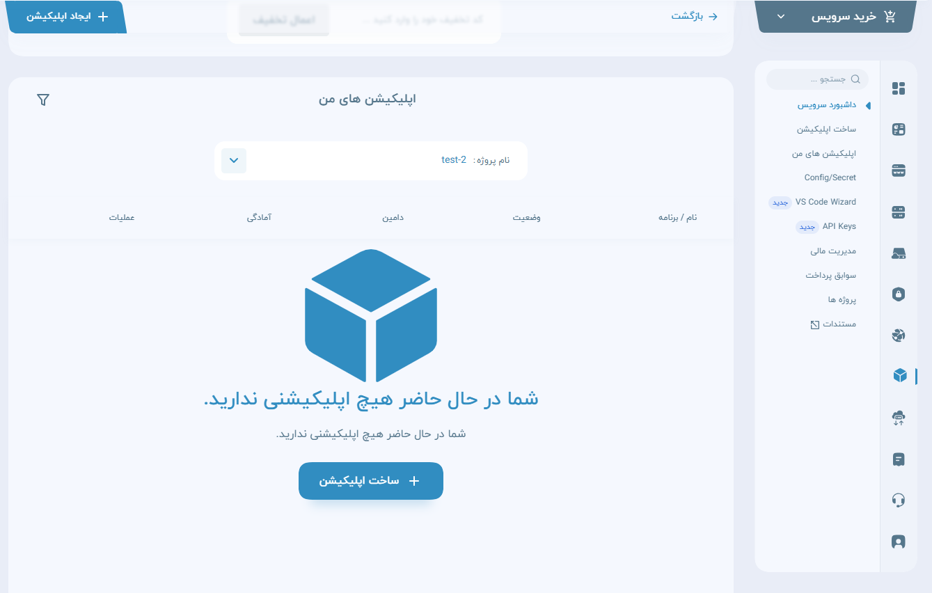 هنگامی که وارد این صفحه میشوید امکان ساخت اپلیکیشن برای شما فراهم هست. طبق تصویر امکان بررسی اطلاعات کلی تمامی پروژهها در این صفحه قرار دارد.