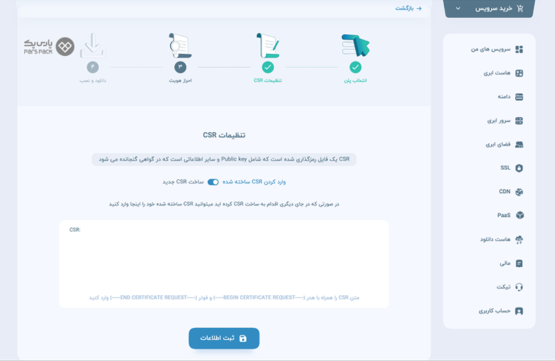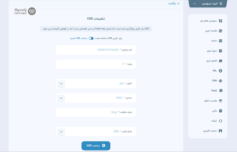 - در صورتی که از قبل CSR ندارید، با روشن کردن دکمه «ساخت CSR جدید» اطلاعات خود را وارد و روی دکمهی «ساخت CSR» کلیک کنید.