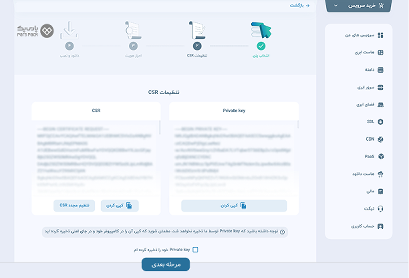 - بعد از تکمیل اطلاعات CSR و ثبت آن، یک صفحه شامل دو کادر با اطلاعات private key و CSR به شما نمایش داده میشود. حتما قبل از ادامه مراحل، private key را ذخیره کنید. بعد از ذخیرهی آن، دکمه «مرحله بعد» را بزنید.
