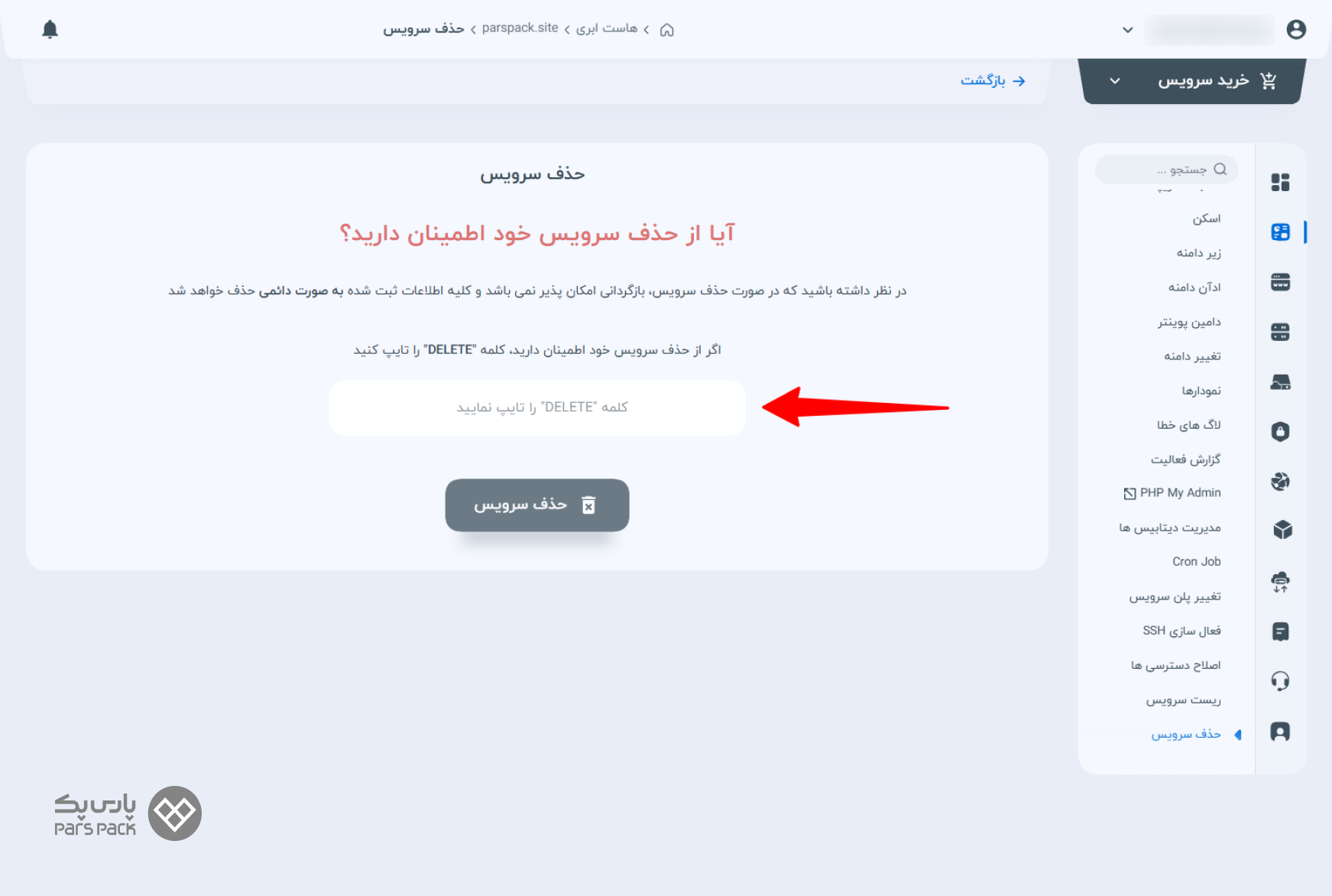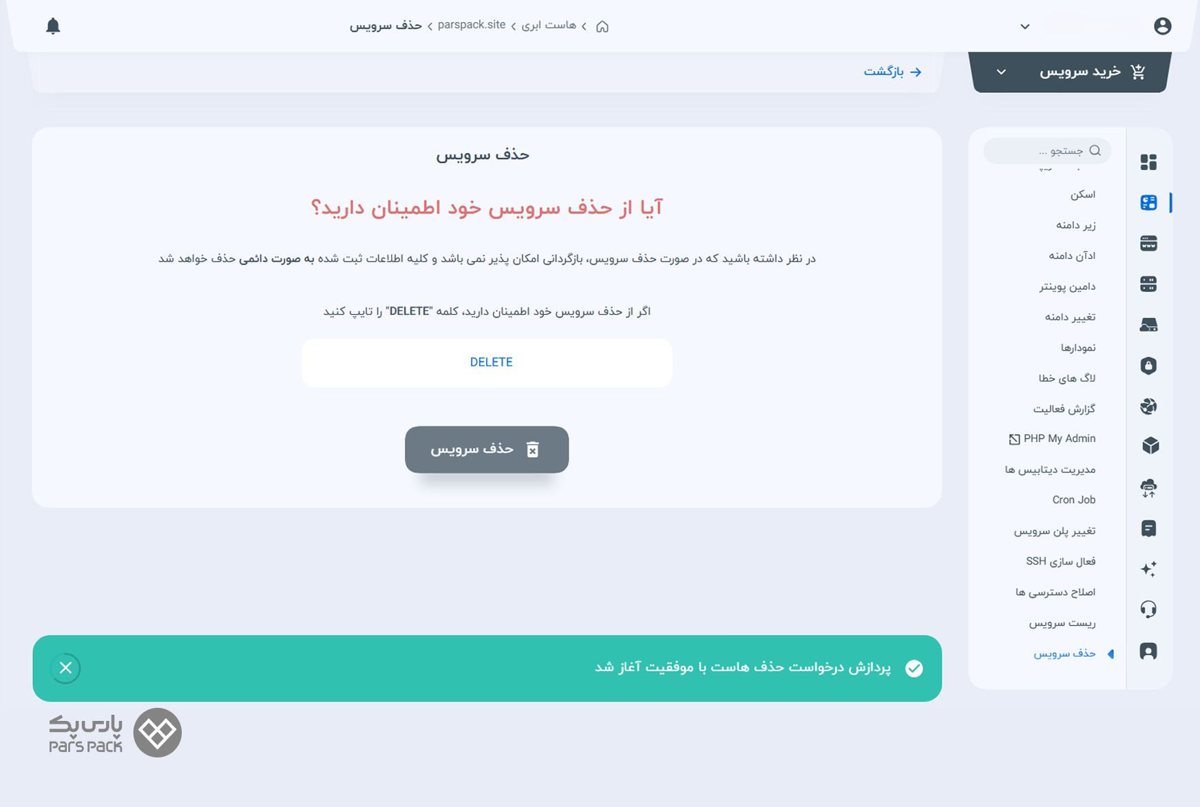 - در این صفحه با تیتر قرمز رنگ «آیا از حذف سرویس خود اطمینان دارید؟» به شما اعلام میکنیم که این عملیات غیرقابلبازگشت است و منجر به از بین رفتن دائمی کلیه اطلاعات و دیتابیسها خواهد شد.