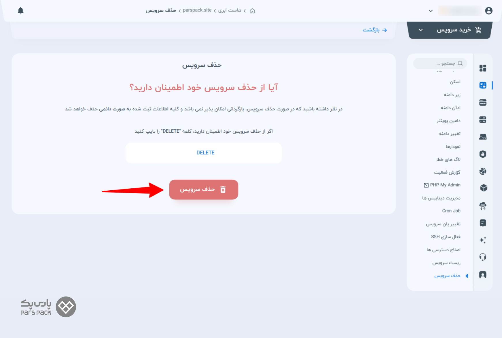 - روی دکمه قرمز رنگ «حذف سرویس» کلیک کنید.