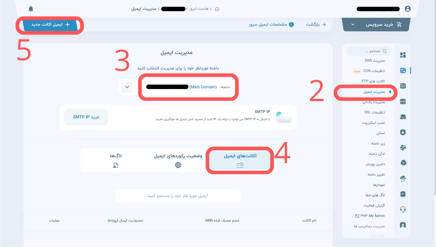 - از منو عمودی سمت راست، گزینه «مدیریت ایمیل» را انتخاب کنید: