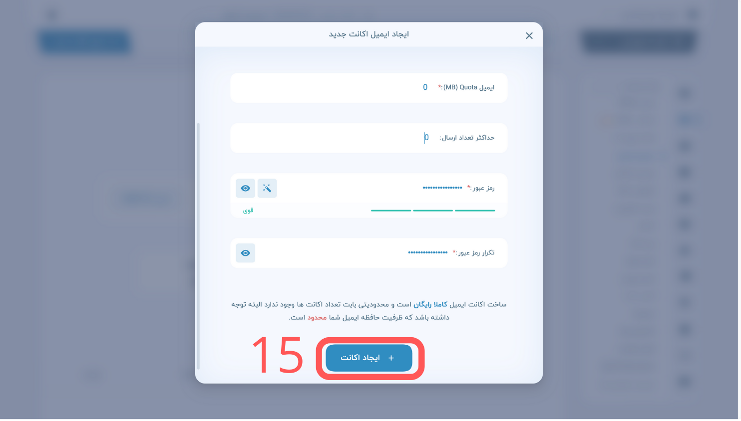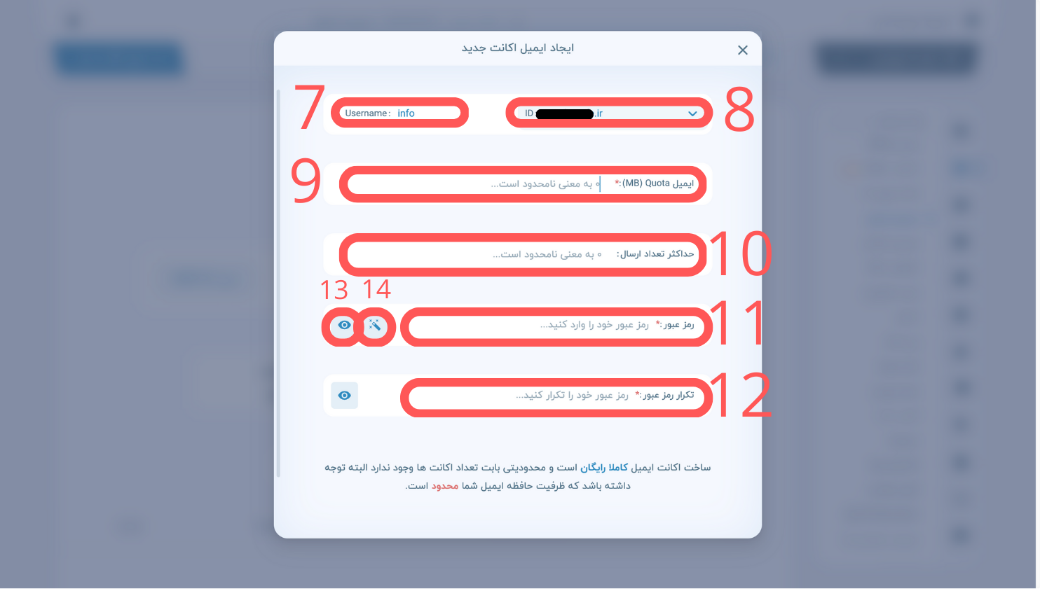 نکتهاگر عدد صفر را درج کنید، هیچ محدودیتی برای تعداد ارسال ایمیل روزانه قابل ارسال توسط این اکانت ایمیل اعمال نخواهد شد و ممکن است موجب اسپم شدن آدرس و اعتبار ایمیلهای ارسالی از دامنه و هاست شما شود.