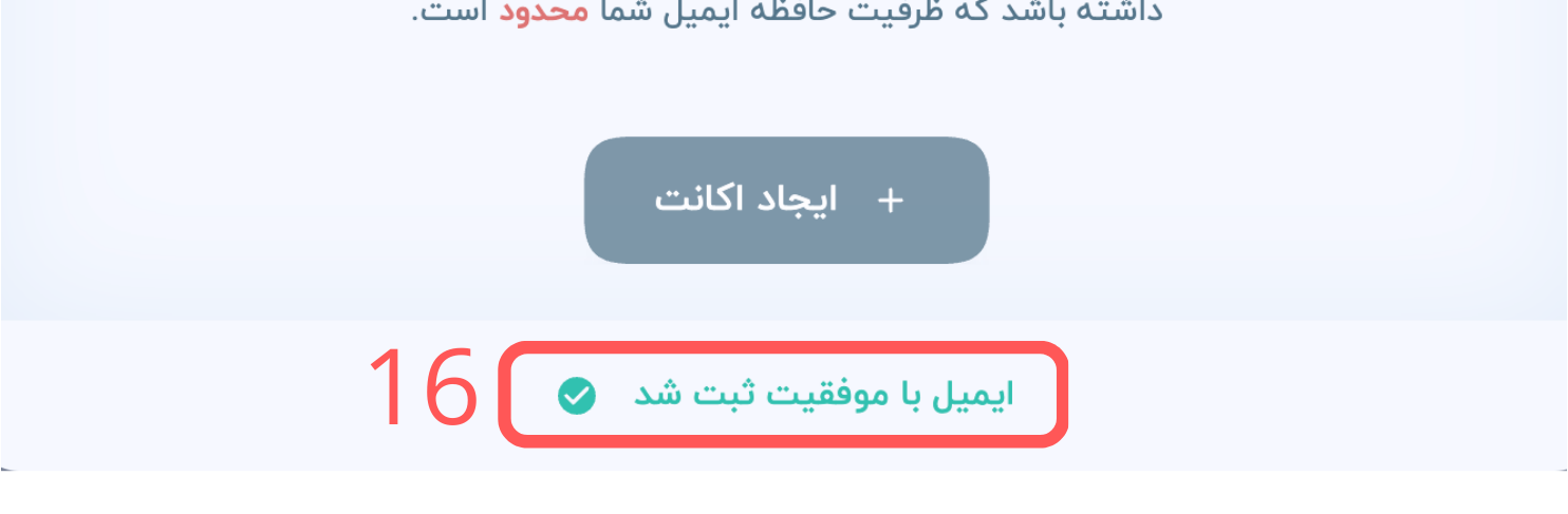 - در صورتی که ساخت اکانت با موفقیت انجام شده باشد. پیام زیر با رنگ سبز و آیکون تیک در زیر دکمه مرحله 15 برای شما به نمایش در خواهد آمد:
