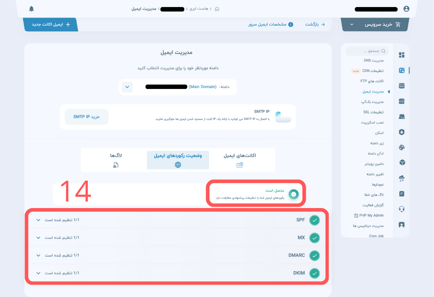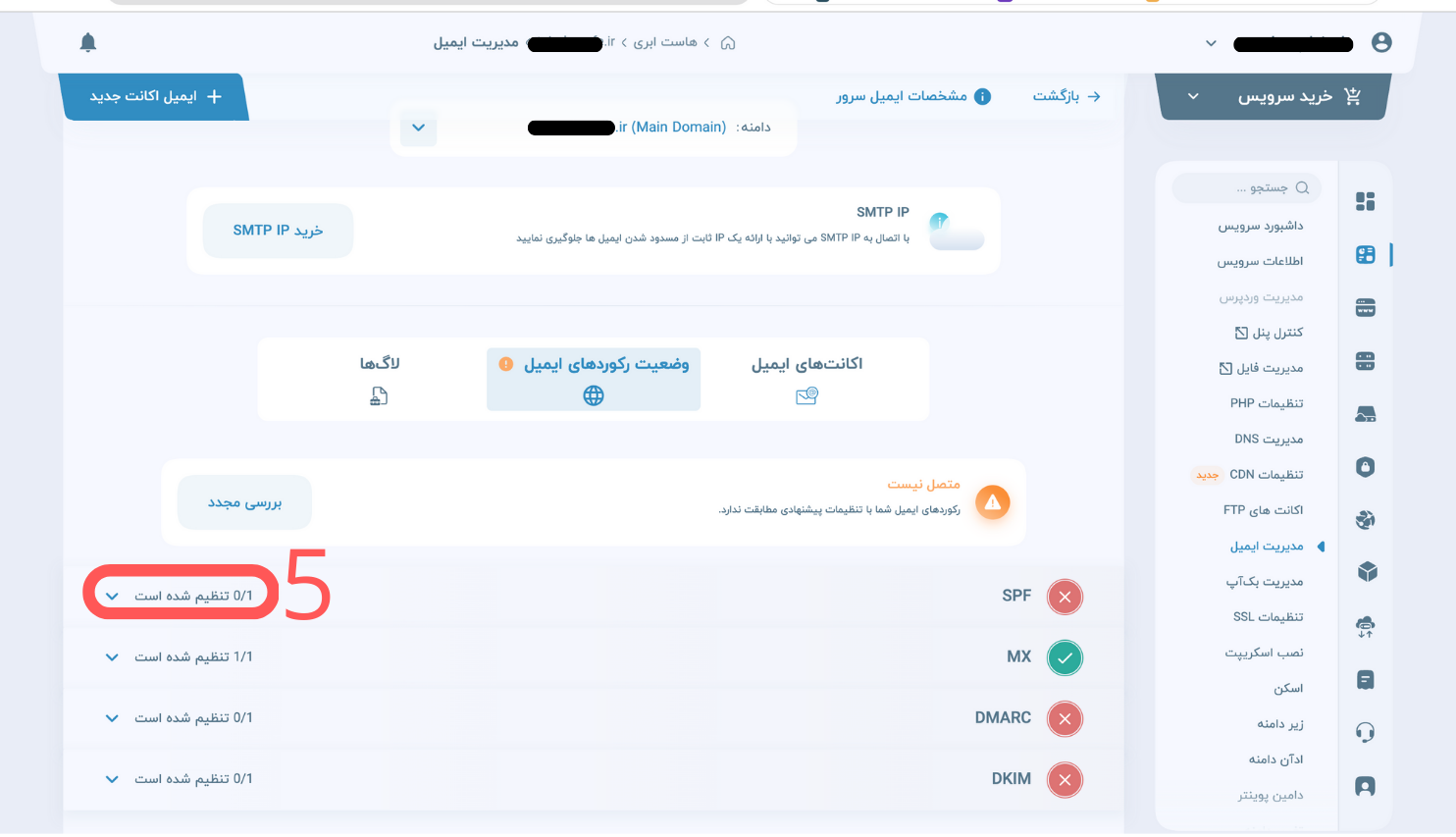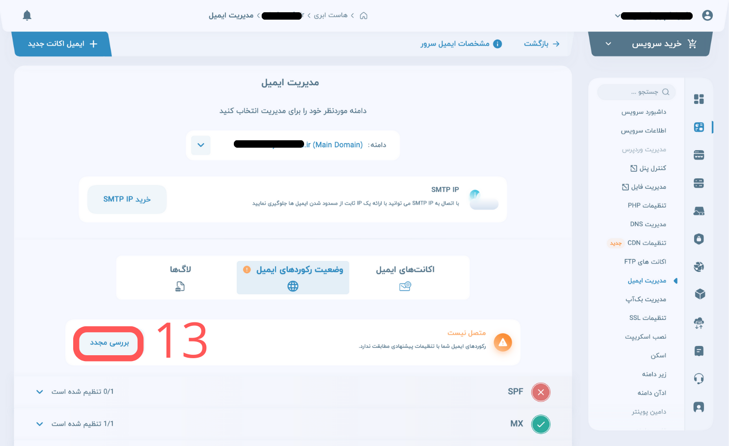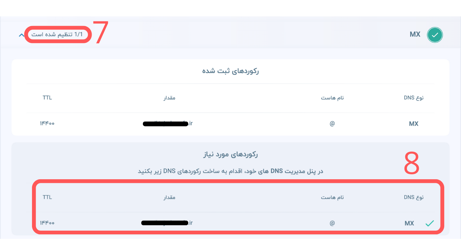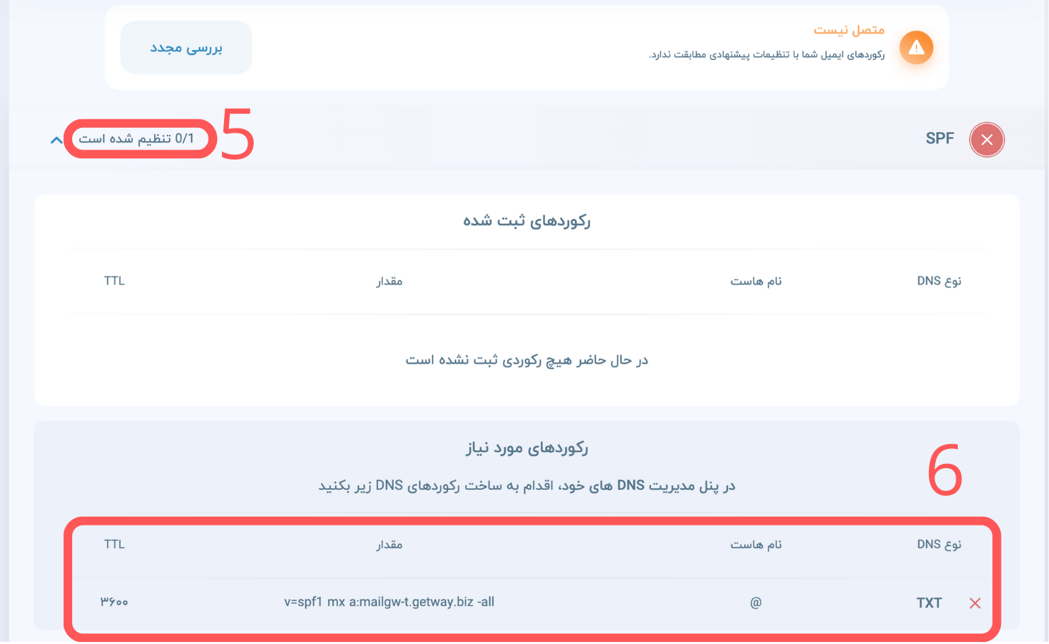 بعد از درج رکوردهای لازم در DNS های دامنه خود دکمه «بررسی مجدد را انتخاب کنید» و منتظر بمانید تا رکوردها بررسی و نتیجه بررسی در پنل شما نمایان شود.