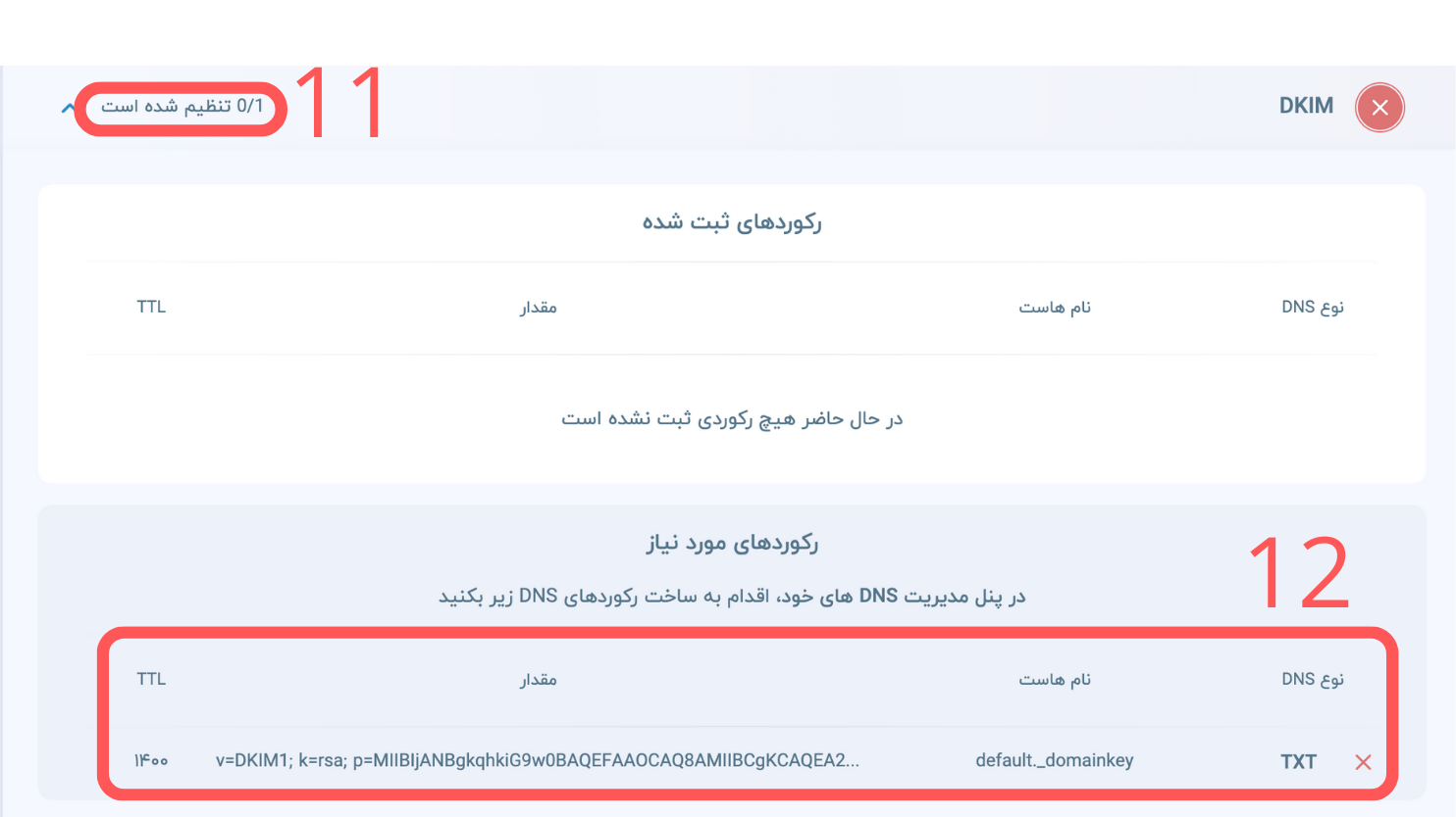 به پایین فضای باز شده و بخش «رکوردهای مورد نیاز» مراجعه کنید و با توجه به اطلاعات درج شده در این قسمت، به سرویس مدیریت DNS دامنه خود* مراجعه و یک رکورد مطابق با جزئیات درج شده در این قسمت ایجاد کنید.