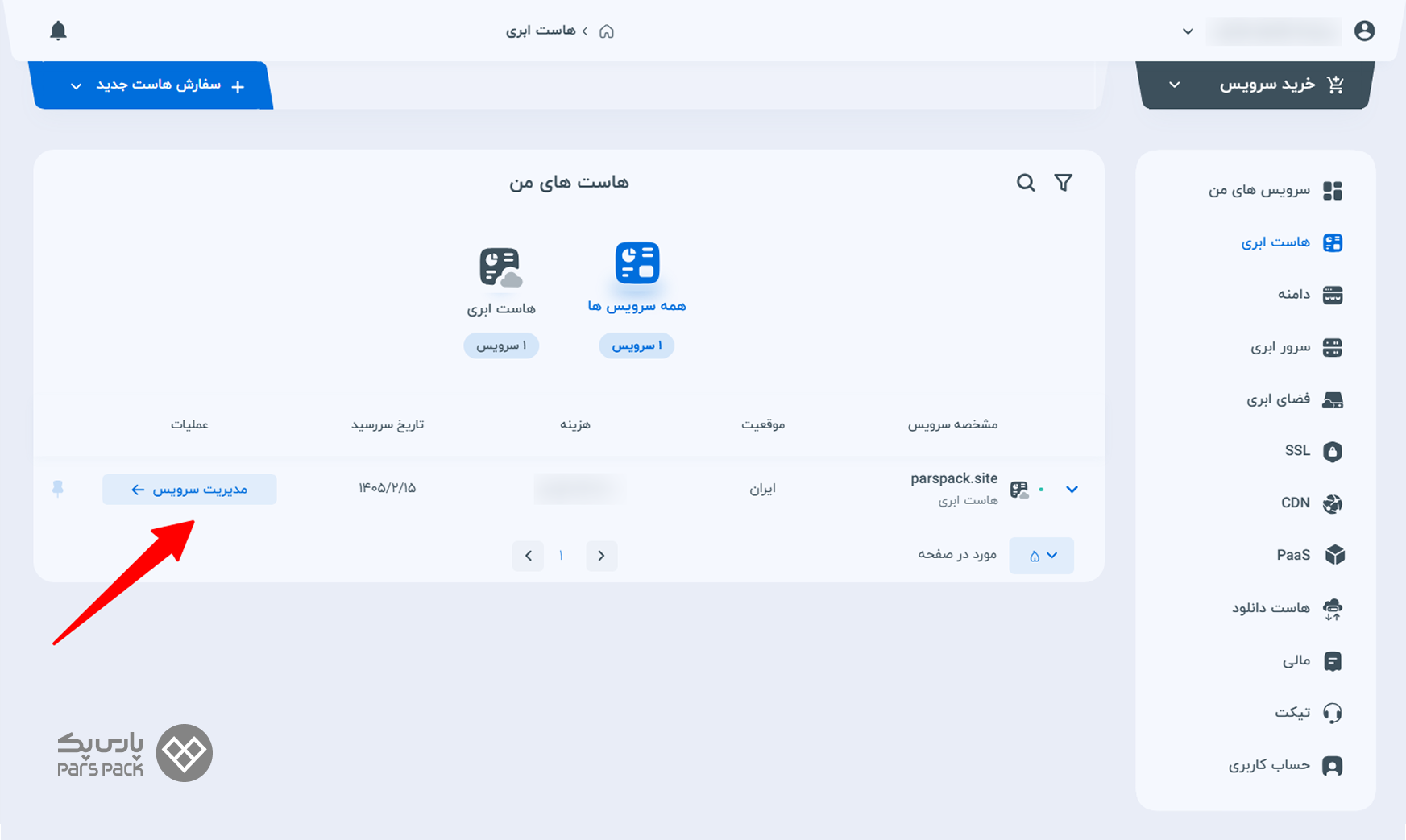 - وارد پنل کاربری پارسپک شوید و از منوی سمت راست، بخش «هاست ابری» را انتخاب کنید.