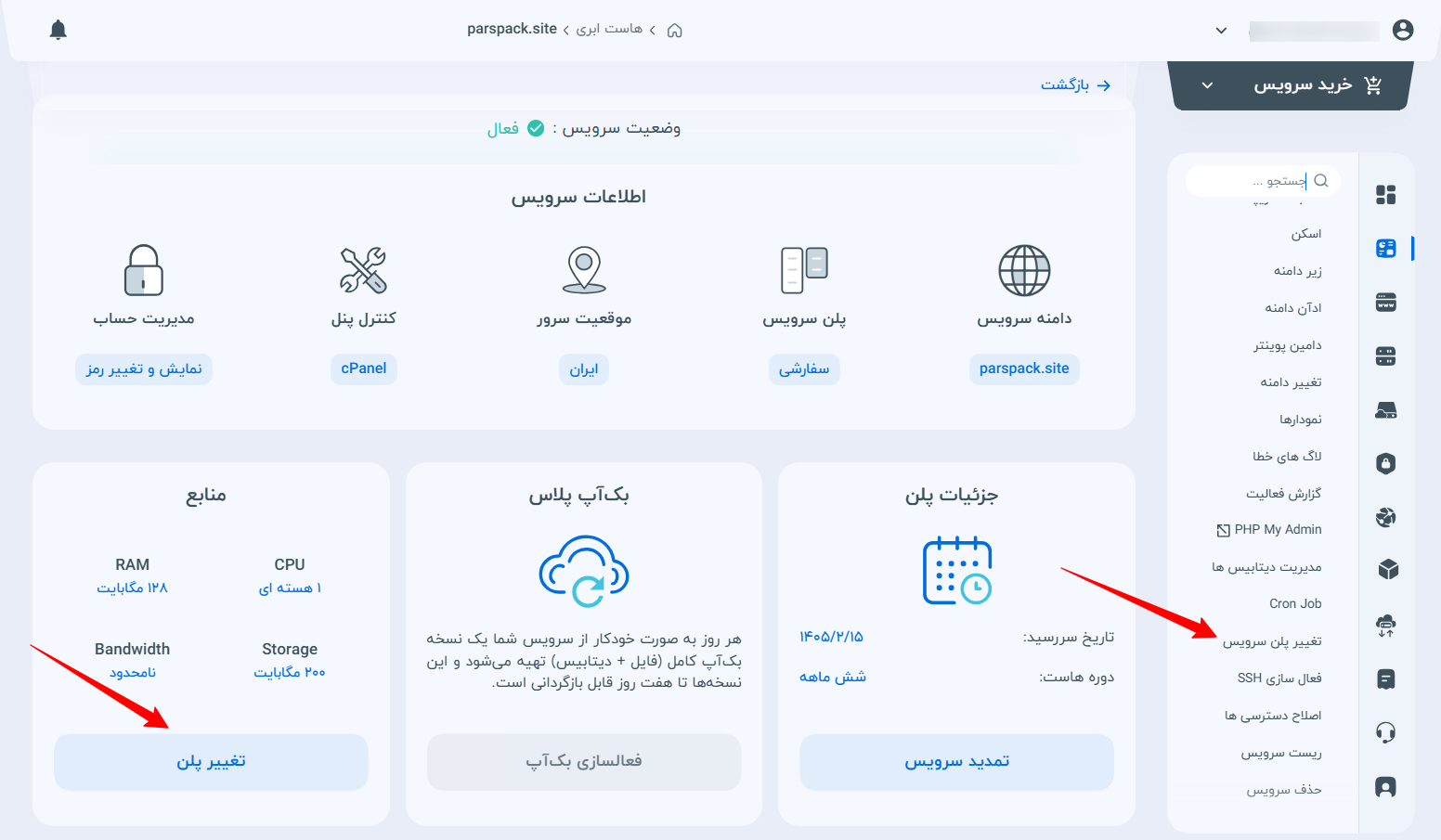 راهنمای گامبهگام تغییر پلن هاست ابری