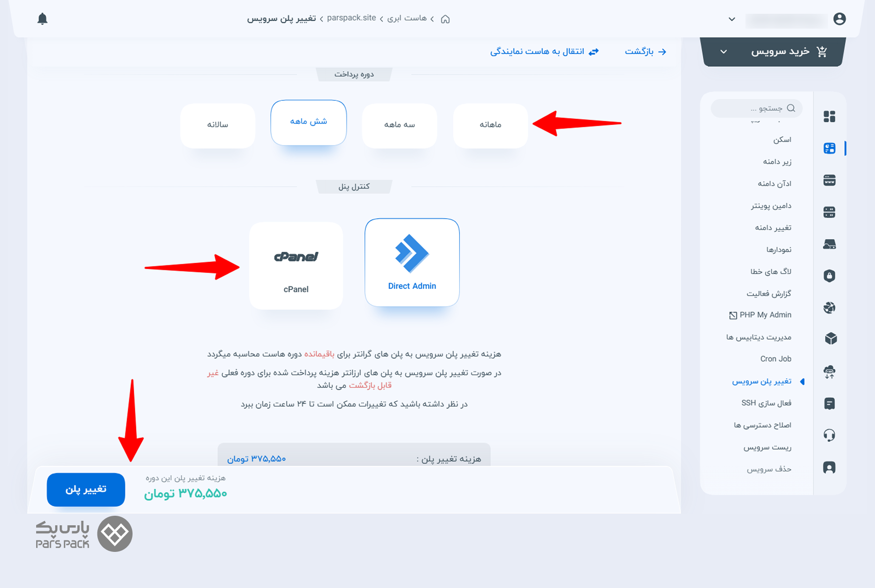 سیاست عدم عودت وجه: در تمامی تغییرات پلن، در صورت انتخاب پلن ارزانتر، هزینه تغییر، قابل بازگشت نیست.