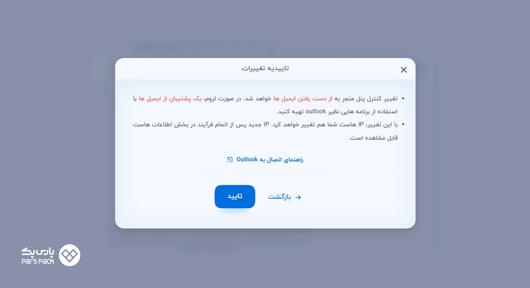 در صورت تغییر کنترلپنل فعلی، تمامی ایمیلهای شما پاک خواهد شد و IP هاست تغییر میکند. پیش از تایید هشدار، حتما از طریق نرمافزارهایی مانند Outlook از ایمیلهای خود بکآپ لوکال تهیه کنید. شما میتوانید راهنمای اتصال به Outlook را در لینک موجود در این بخش، مطالعه کنید.