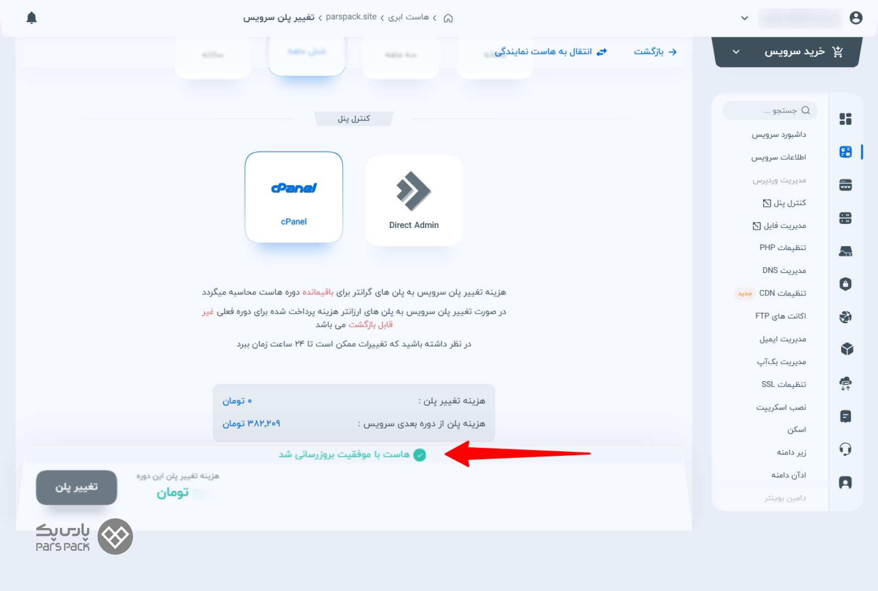 - حالت اول (بدون هزینه): اگر هزینه صفر تومان باشد، تغییرات بلافاصله اعمال شده و پیام «هاست با موفقیت بروزرسانی شد» نمایش داده میشود.