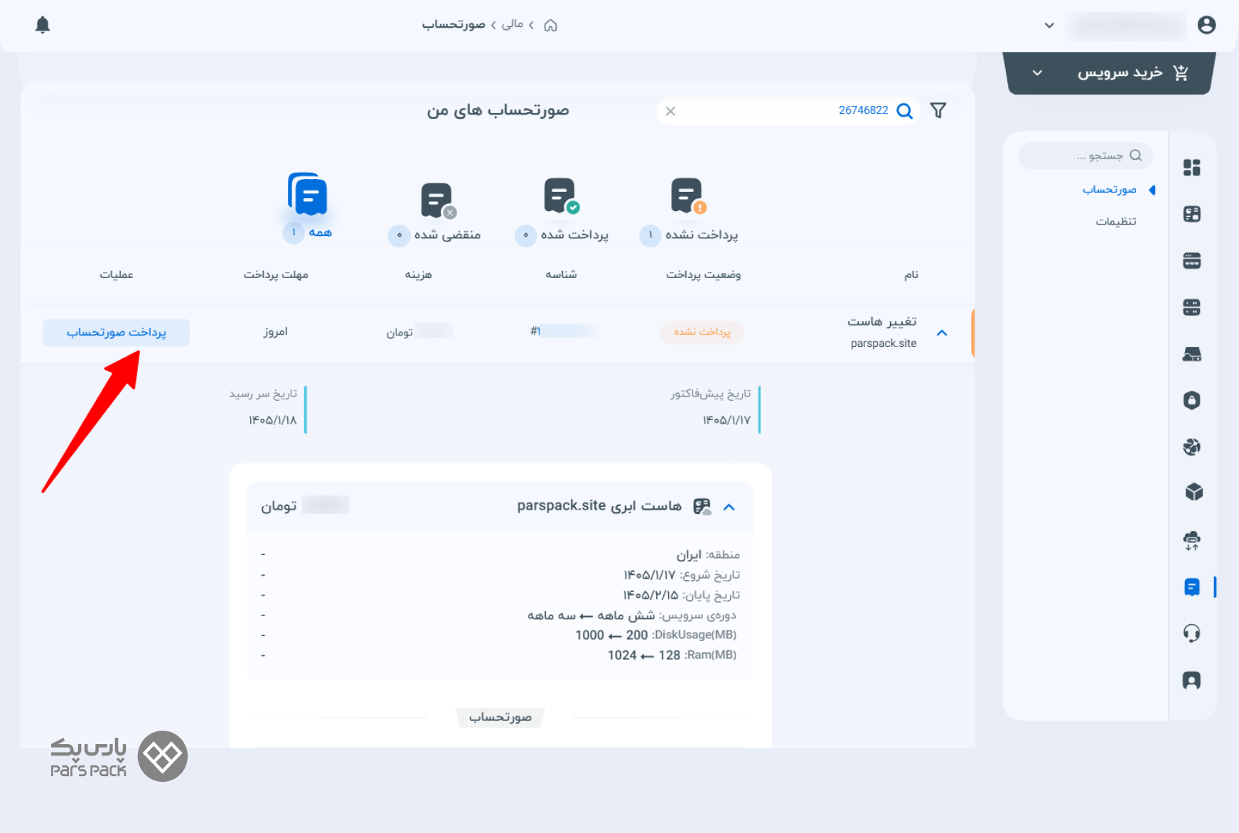 در صورت تایید، پیش از اتمام تاریخ انقضای فاکتور، روی «پرداخت صورتحساب» کلیک کنید تا پس از پرداخت موفق، منابع جدید روی سرور شما اعمال گردد.