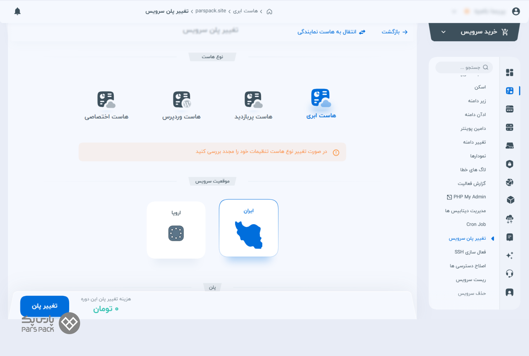 هاست ابریراهنمای گامبهگام تغییر پلن هاست ابریتغییر نوع هاستتغییر نوع هاستشما میتوانید بسته به نیاز خود، معماری سرویس را از هاست ابری به پربازدید، وردپرس یا اختصاصی تغییر دهید.