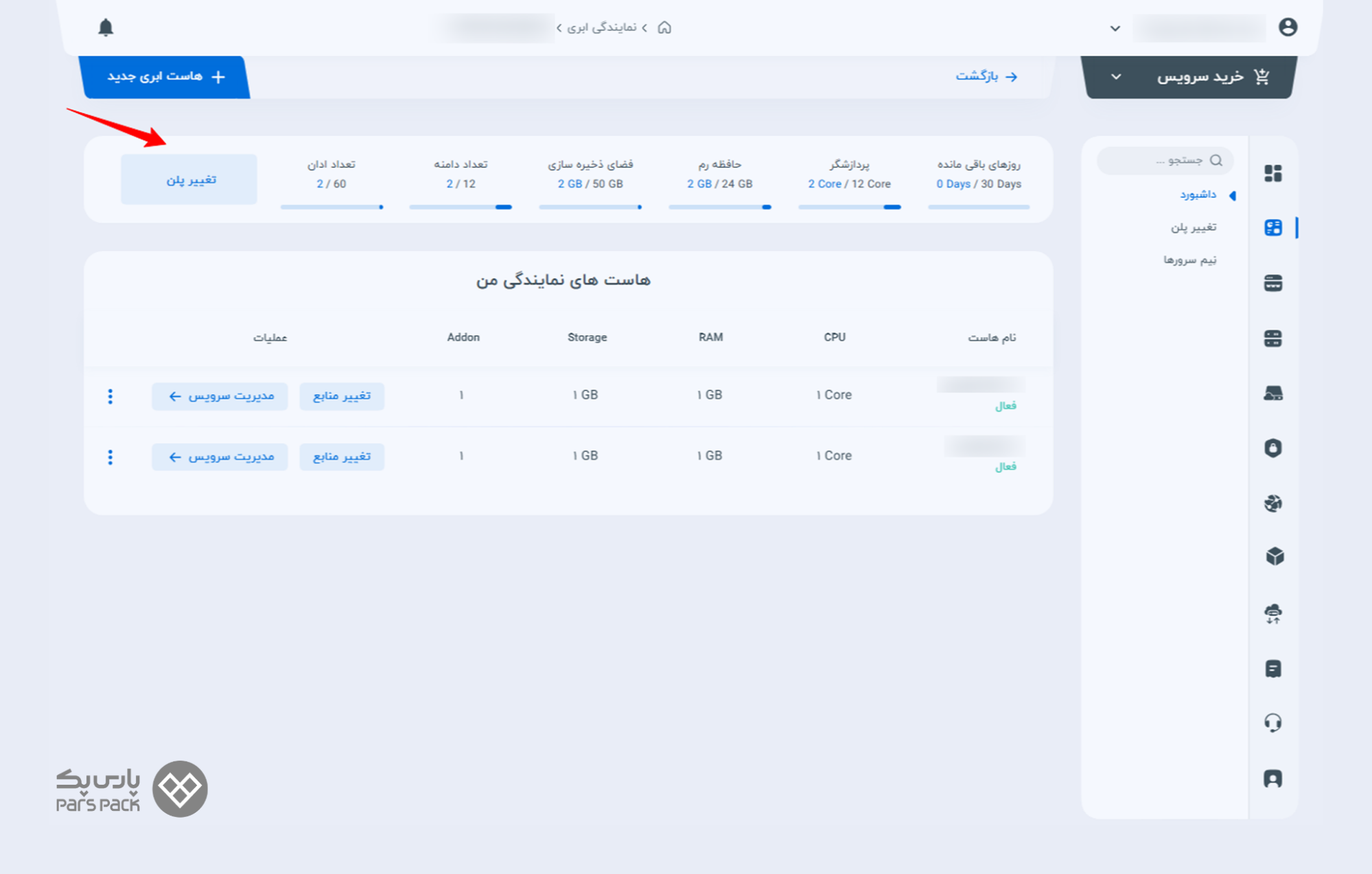 - روی «تغییر پلن» کلیک کنید. پس از پرداخت صورتحساب جدید، منابع ارتقایافته بهصورت آنی به داشبورد نمایندگی شما اضافه میشود.