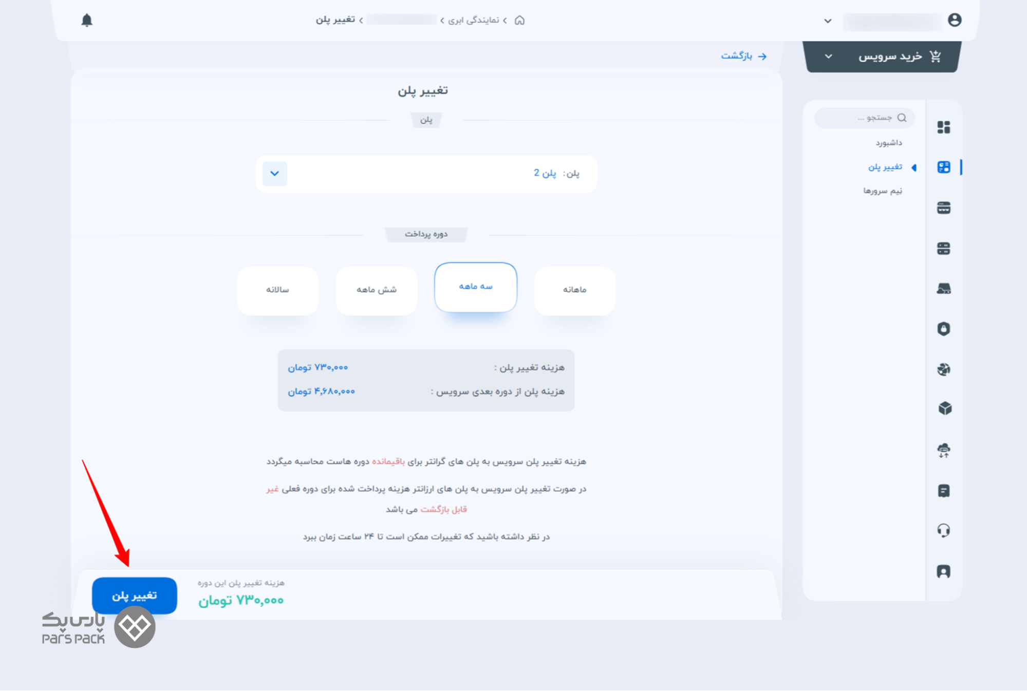 - پلن جدید و دوره پرداخت مدنظرتان را انتخاب کنید.