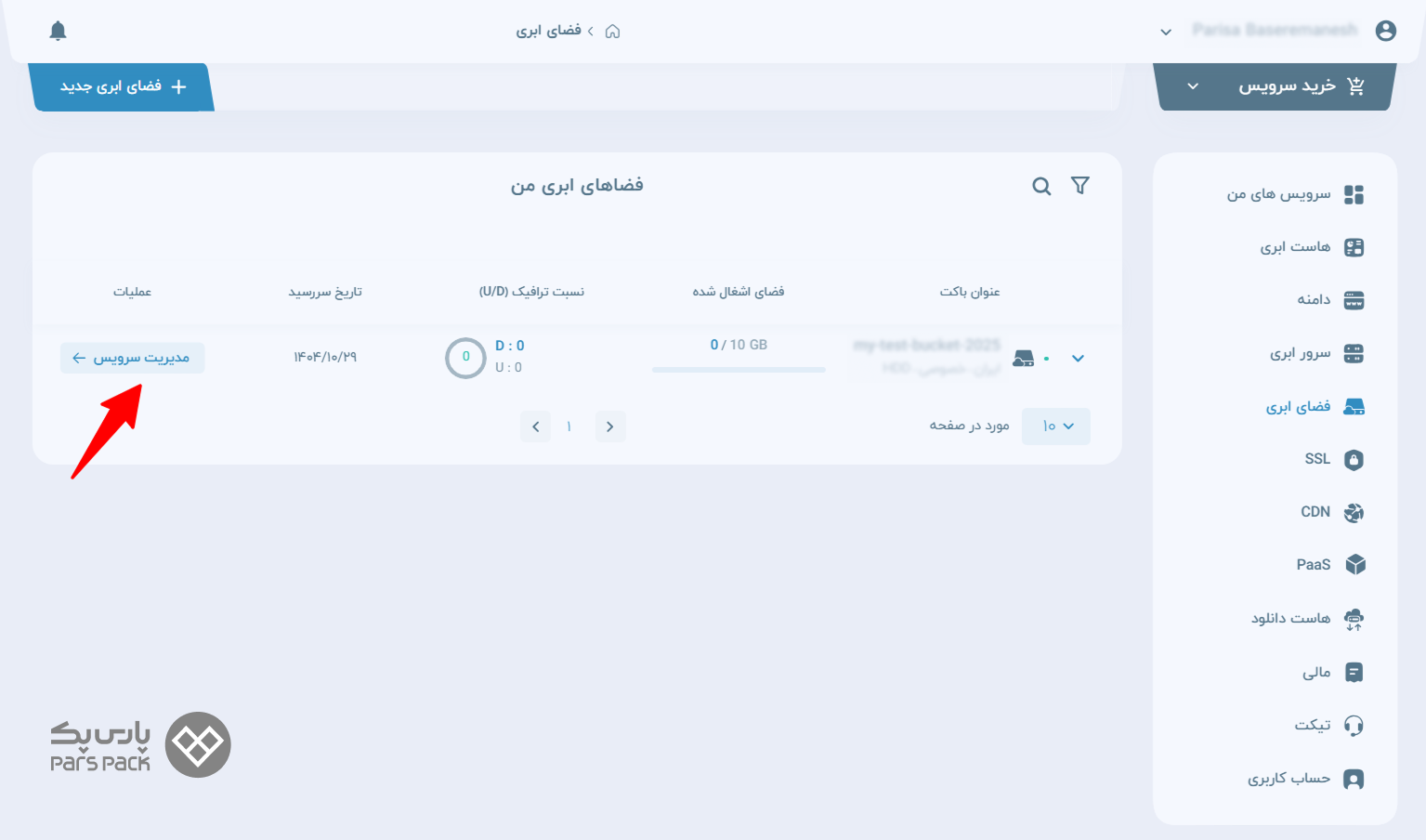 ۱. در پنل فضای ابری پارسپک با انتخاب گزینه «مدیریت آبجکتها» میتوانید به باکت خود دسترسی پیداکرده و فایلهایتان را در آن آپلود کنید.