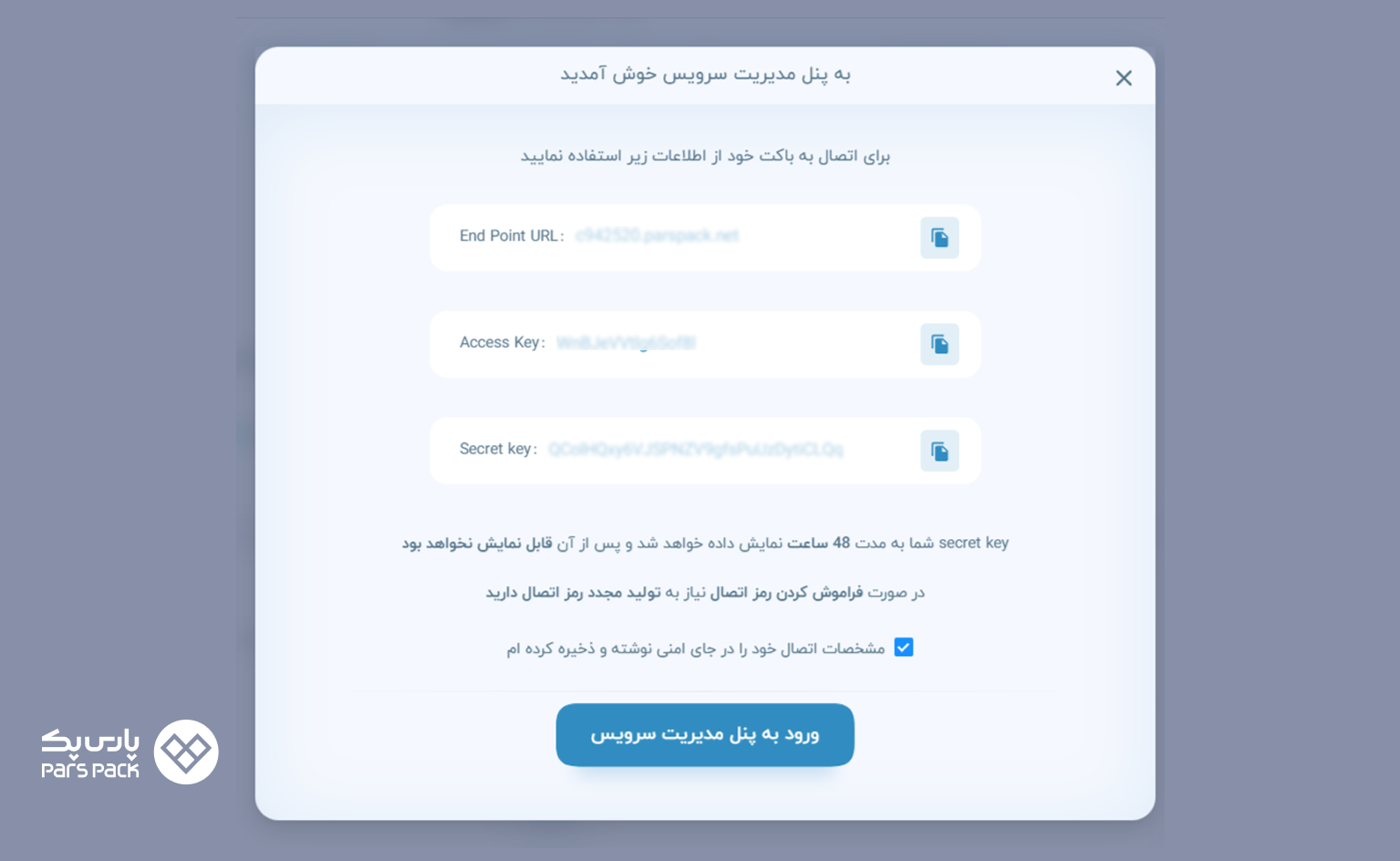 - اطلاعات دسترسی: (Secret Key، Access Key، End Point) که باید از پنل پارسپک بردارید.