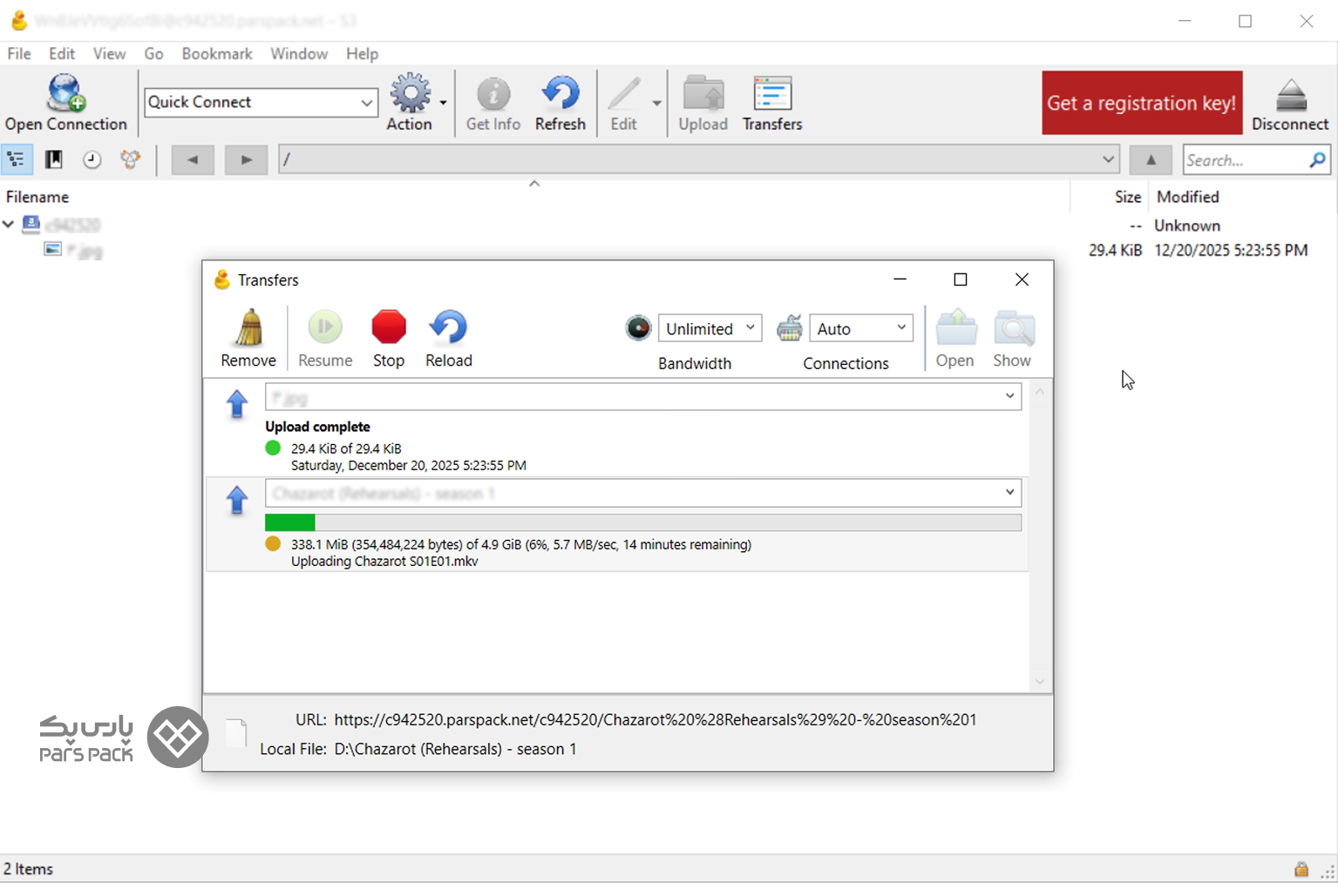 اگر اینترنت ناپایداری دارید، نگران نباشید. تنظیمات پارسپک به گونهای است که اگر آپلود قطع شود، با زدن دکمه Resume (ادامه)، فایل از همانجا که مانده ادامه مییابد و نیازی به آپلود مجدد از صفر نیست.