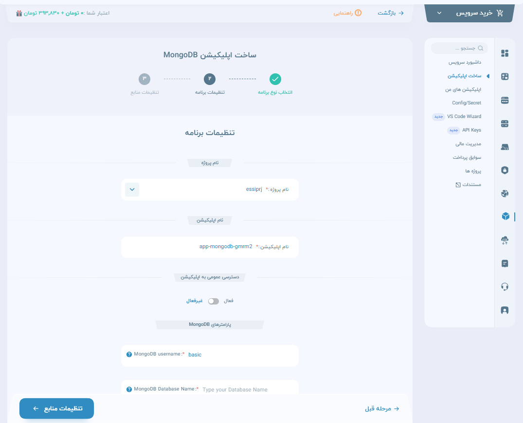 برای مونگو تعدادی پارامتر در صفحه ساخت آن وجود دارند که میبایست تنظیم شوند: