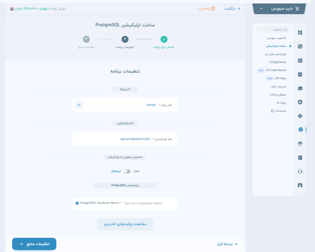 ساخت PostgreSQL در منوی PaaS: