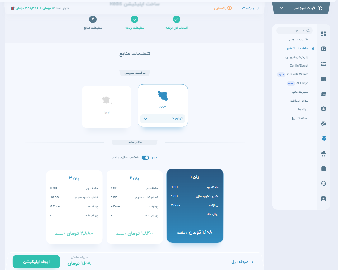 - در این بخش شما میتوانید موقعیت سرویس و بعد از آن منابع مصرفی اپ را تنظیم کنید. در قسمت تنظیم منابع شما از طریق یک سوییچ، دو گزینه خواهید داشت، گزینه پلن و گزینه شخصیسازی منابع: