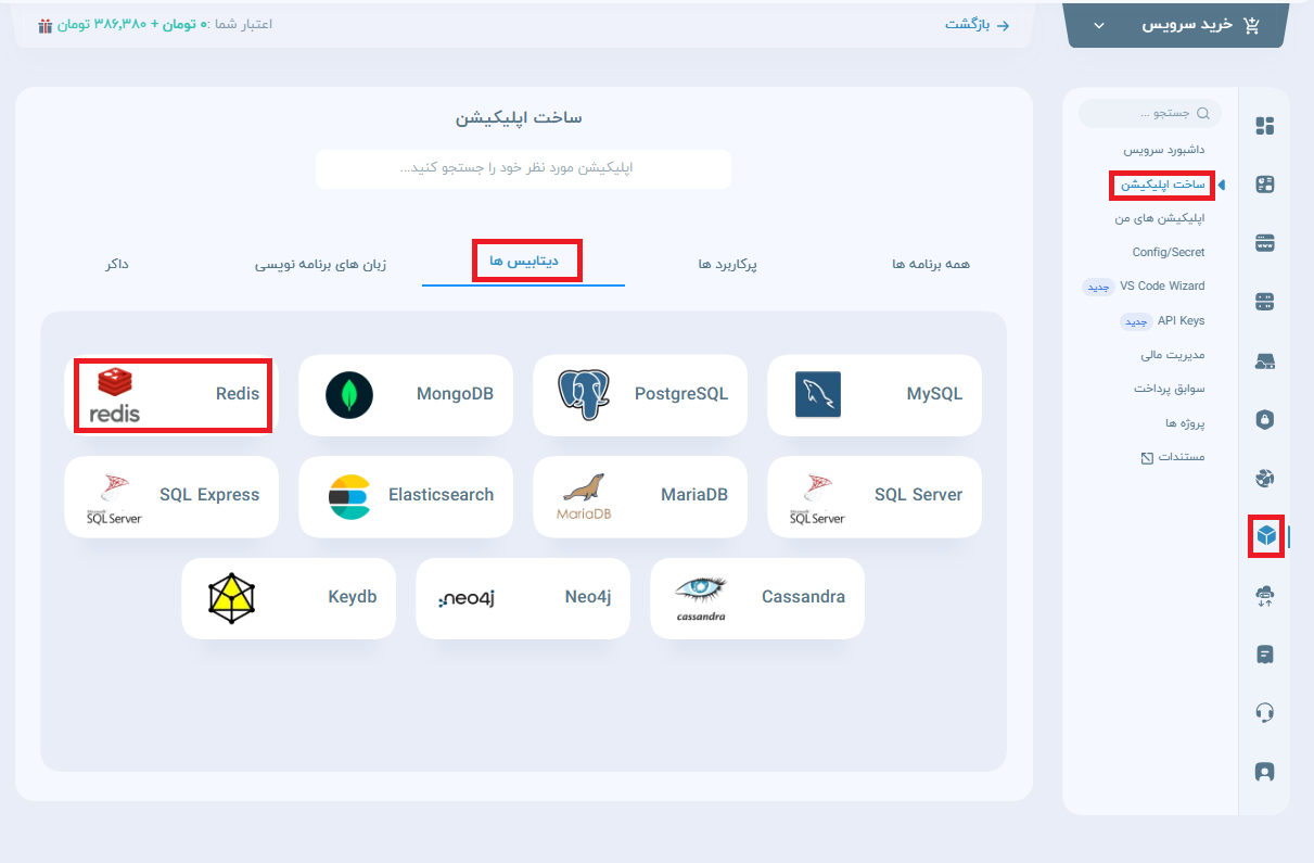 نوع برنامه را میتوانید از بین مواردی که در بخش «ساخت اپلیکیشن» توضیح داده شد انتخاب کنید، برای ساختن اپ در منوی PaaS، میتوانید در پنل کناری با انتخاب گزینه «ساخت اپلیکیشن» و بعد در پنجره «ساخت اپلیکیشن» گزینه «پیکربندی» را انتخاب کنید: