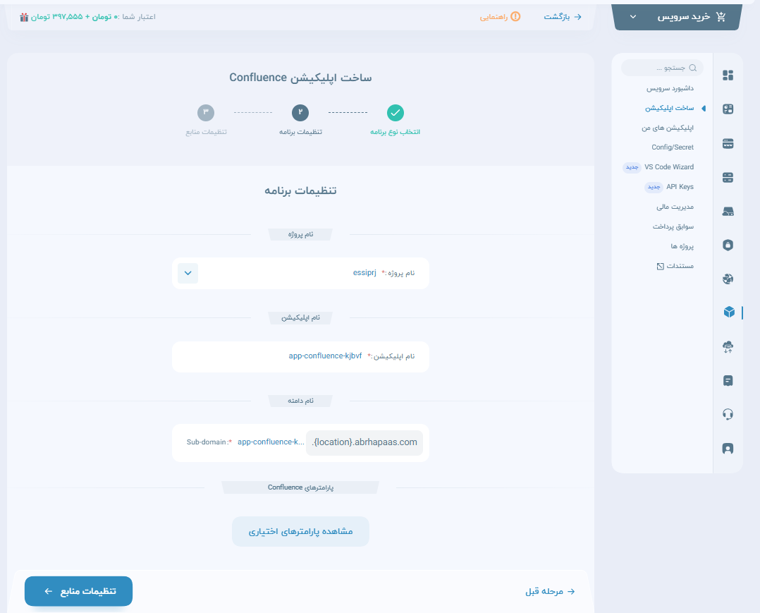 دقت کنید که این اپ نیاز به یک دیتابیس دارد که برای آن PostgreSQL در نظر گرفته شده است، لذا میتوانید ورژن پسگرس را در پارامترهای اختیاری علاوه بر ورژن خود confluence انتخاب کنید.