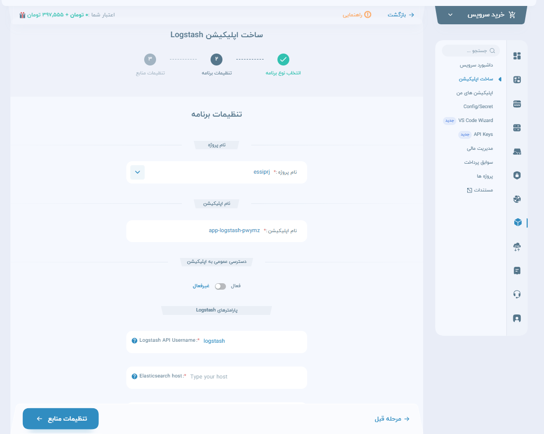 برای این اپ همانند kibana، باید Elasticsearch Host، Elasticsearch Username و Elasticsearch API Username تعریف شود، همچنین شما میتوانید پارامترهای اختیاری Elasticsearch Password و Logstash API Password را هم وارد کنید.