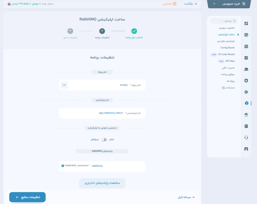 پارامترهای اجباری: RabbitMQ username: این پارامتر یوزر اولیه rabbitmq را تعیین میکند که مقدار اولیه «rabbitmq» برای آن در نظر گرفته شده است که در صورت نیاز میتوانید آن را تغییر دهید.