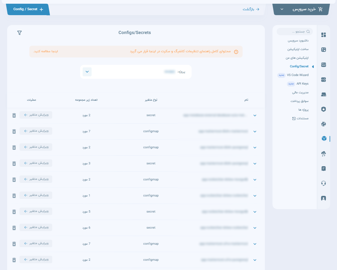 در این منو شما به تمامی Configها و Secretهایی که در قسمت مدیریت هر اپ ساختید و همچنین Configها و Secretهایی که به صورت پیشفرض و با ساخته شدن اپها ایجاد میشوند، دسترسی داشته و میتوانید هر کدام از آنها را به جز مواردی از پیشفرضها، ادیت کنید. (آنهایی که دکمه «ویرایش متغیر» در جلوی آنها به رنگ آبی هستند قابل ادیت هستند.) مانند تصویر زیر: