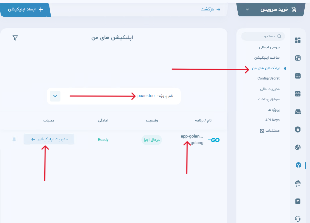 برای اپلیکیشن مورد نظر که در پروژه مدنظر قرار دارد، در صفحه اپلیکیشنهای من، وارد بخش مدیریت اپلیکیشن شوید.