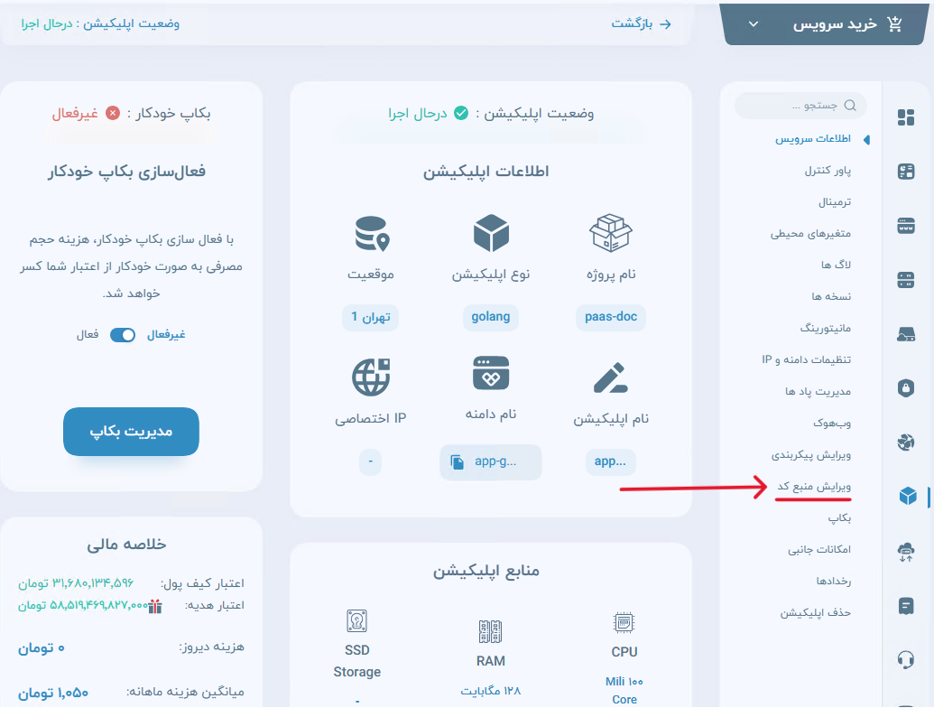امکان ویرایش منبع کد تنها برای اپلیکیشنهایی از نوع Programming-Languag یا Docker وجود دارد.