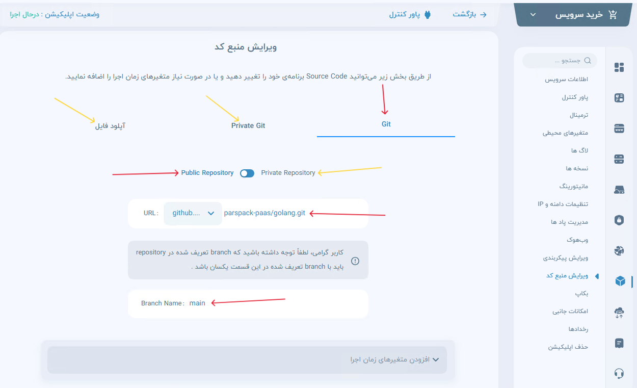 موارد قرمز رنگ مقادیر فعلی منبع کد اپلیکیشن هستند. این موارد در صورت نیاز به همراه موارد زردرنگ میتواند تغییر کند؛ به عنوان مثال سورس جدید با استفاده از روش آپلود فایل فشردهشده سورس کد مدنظر یا با استفاده از Private Git ایجاد شود.