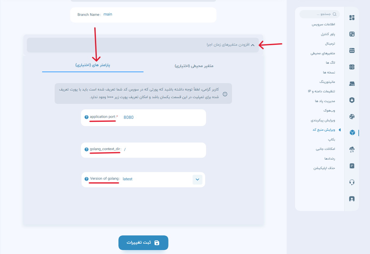 در قسمت افزودن متغیرهای زمان اجرا هم میتوان پارامترهای قبلی اپلیکیشن را تغییر داد؛ به عنوان مثال port یا context_dir بعد از آن دکمه ثبت تغییرات را میزنیم تا تغییرات جدید برای سورس کد اعمال شود.