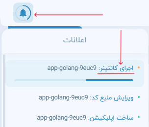 بعد از ثبت تغییرات میتوانید فرایند ویرایش منبع کد خود را به صورت مرحله به مرحله از لیست اعلانها دنبال کنید (آمادهسازی نسخه اپلیکیشن، بررسی ورودی، ساخت نسخه، اجرای کانتینر، استقرار اپلیکیشن، بهروزرسانی).