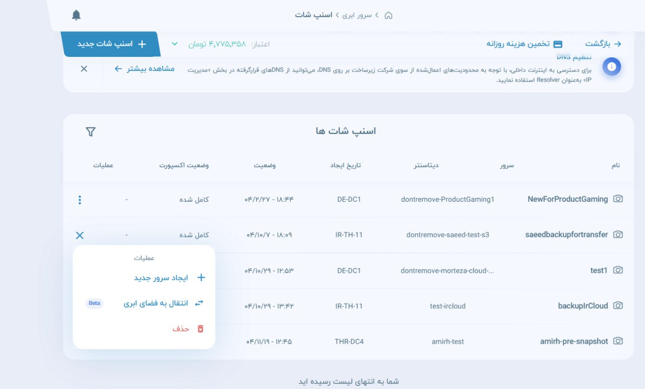 - برای انتقال رکورد اسنپ شات و بکاپ خودکار به S3 نیاز است در صفحه ای که رکورد اسنپ شات و یا رکورد بکاپ وجود دارد در ستون عملیات روی سه نقطه کلیک کرده و روی دکمه انتقال به فضای ابری کلیک نمایید . انتقال بکاپ اروپا به S3 اروپا و بکاپ ایران به S3 ایران امکان پذیر است .